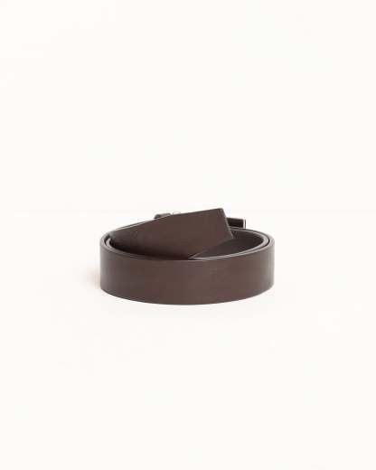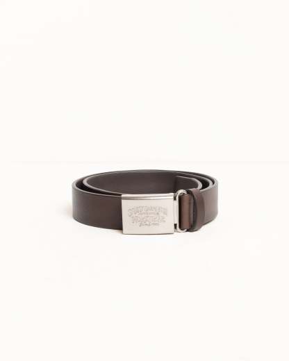 - Leather belt with metal plaque buckle