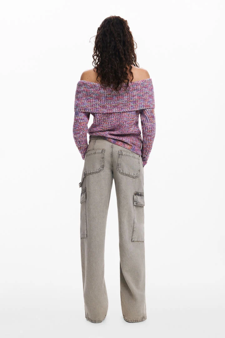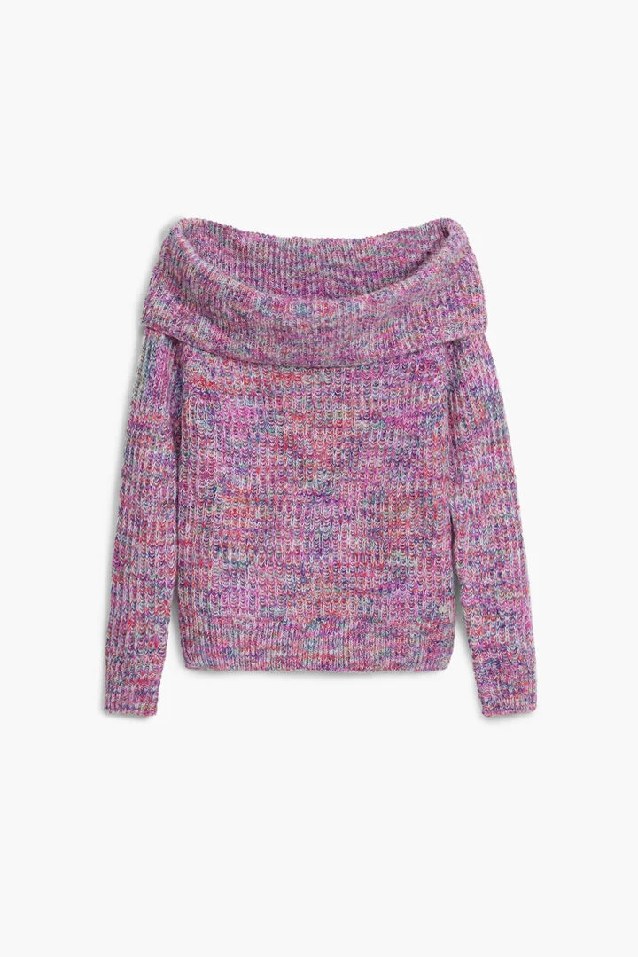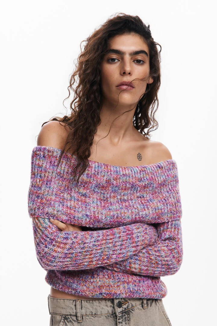 Multicolored knit sweater with long sleeves and Bardot neckline