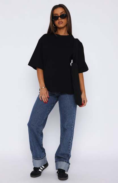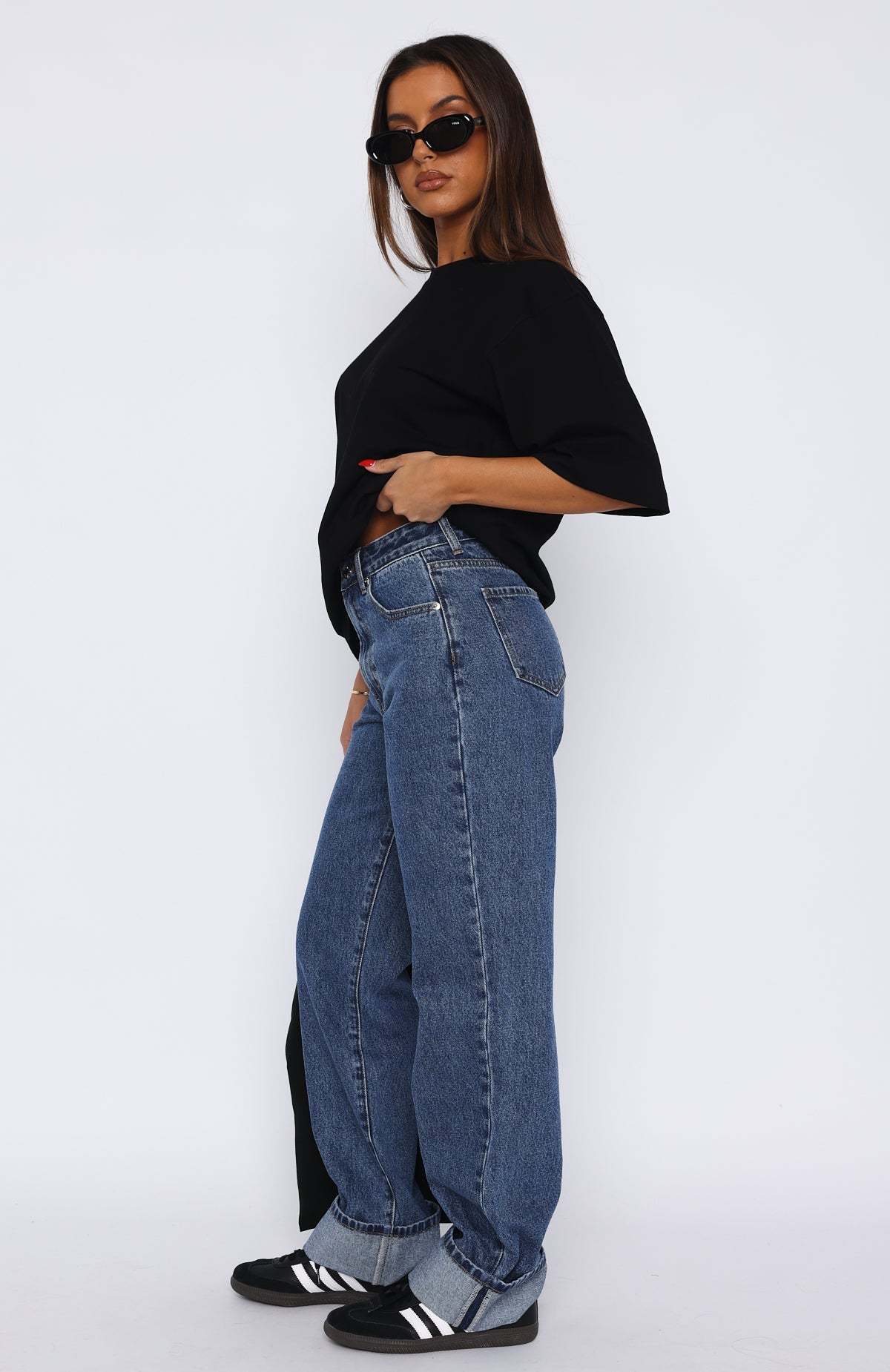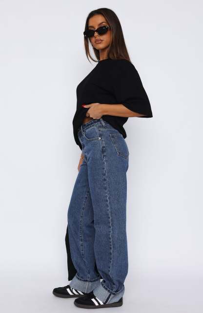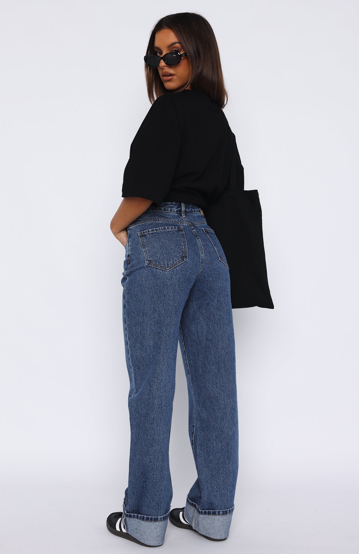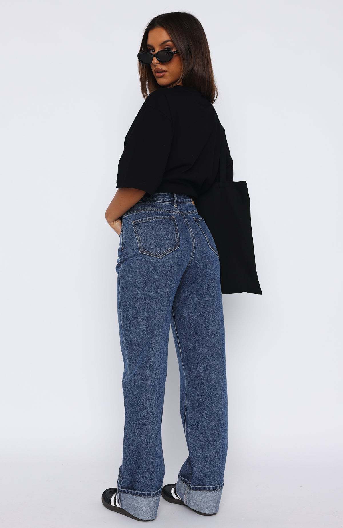 These high rise, relaxed fit jeans feature wide leg style, silver button closure, folded cuff hem design & zip at front, belt loops and 5 pocket design. We love this paired with a cute crop and sneakers for the perfect weekend look!