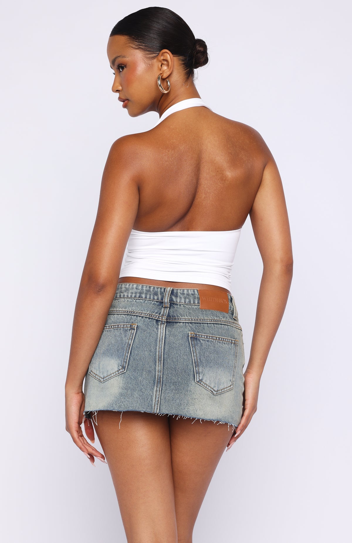 Short but sweet! The Broken Trust Denim Mini Skirt in Brown Blue features belt loops, a front button and zipper closure, and a five-pocket design. The frayed hem adds a touch of casual flair, while the unlined interior ensures comfort. Finished with a faux leather White Fox label on the side back. Style with an off the shoulder top and boots for a chic look!