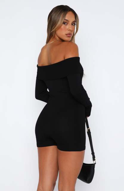 When you're ready for chill time, the City Of Love Long Sleeve Playsuit Black will be the easy outfit you need. Features an off-the-shoulder fit, folded over hem design, ribbed knit stretch fabric, booty short length, hugging fit and slip-on design. She's a wear-anywhere kind of design!