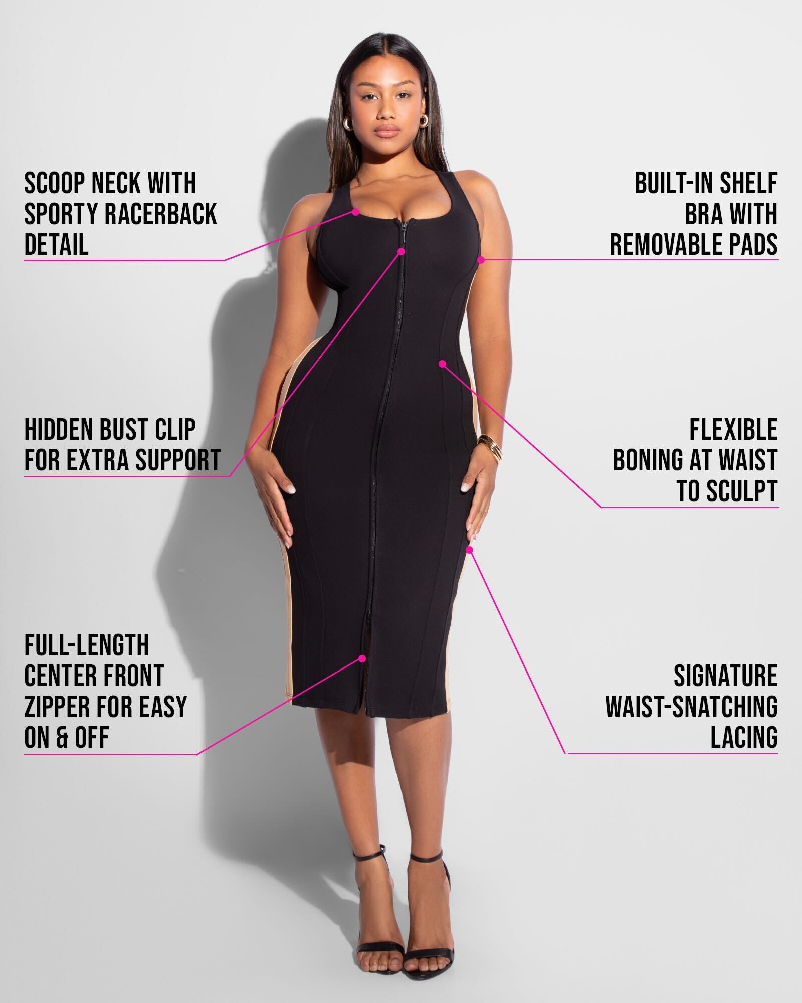 - Built-in shapewear that smooths, sculpts, and supports - no extra layers required.