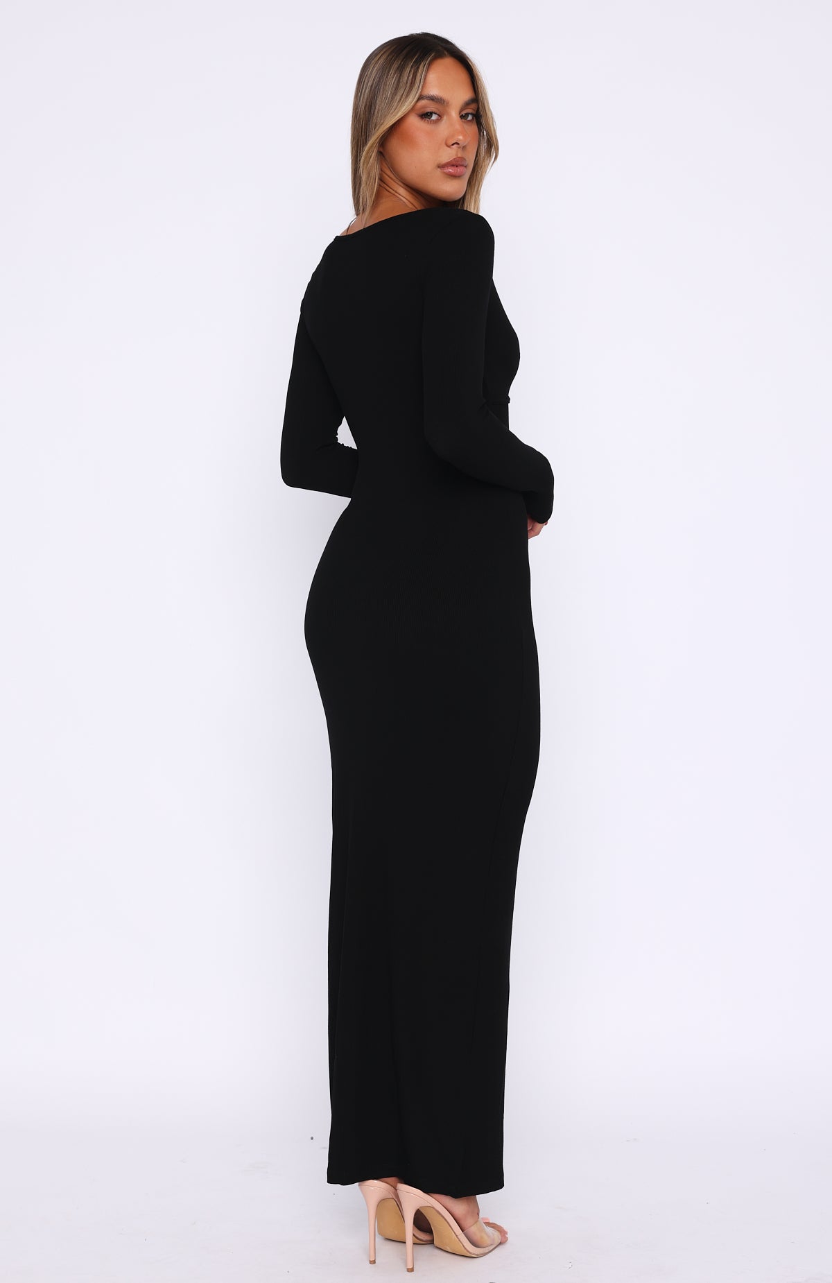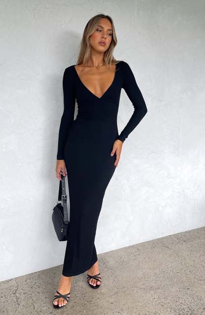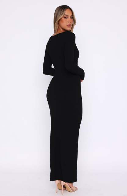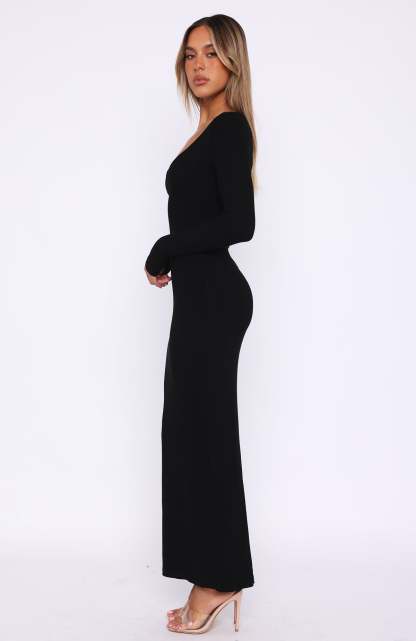 Make weekend styling simple with the Fresh Season Long Sleeve Knit Maxi Dress in Black. Featuring a low neckline, long sleeves and soft, ribbed stretch fabric. Dress it up with perspex heels and gold accessories or for an everyday look pair with sneakers for an effortlessly chic look!