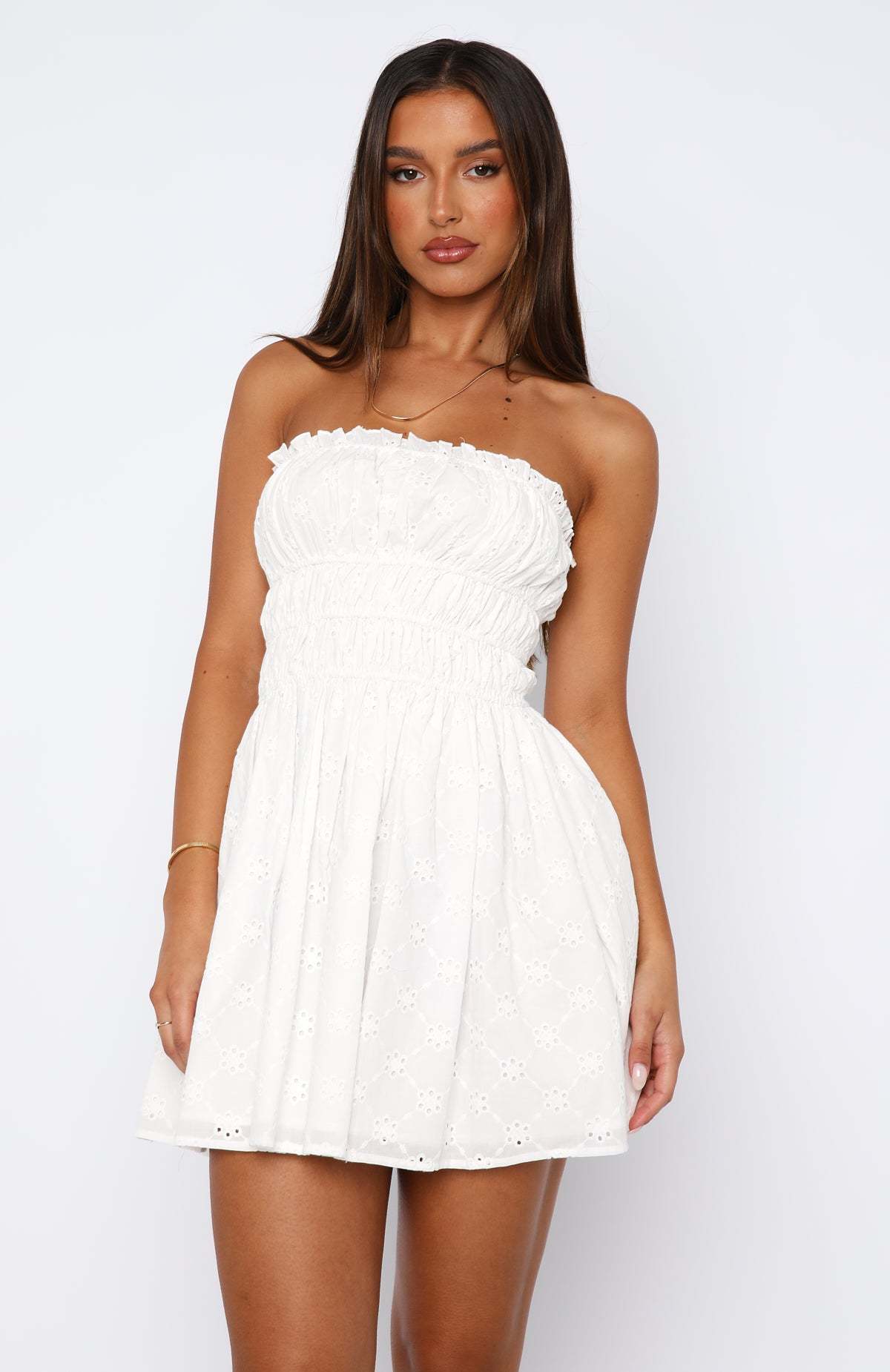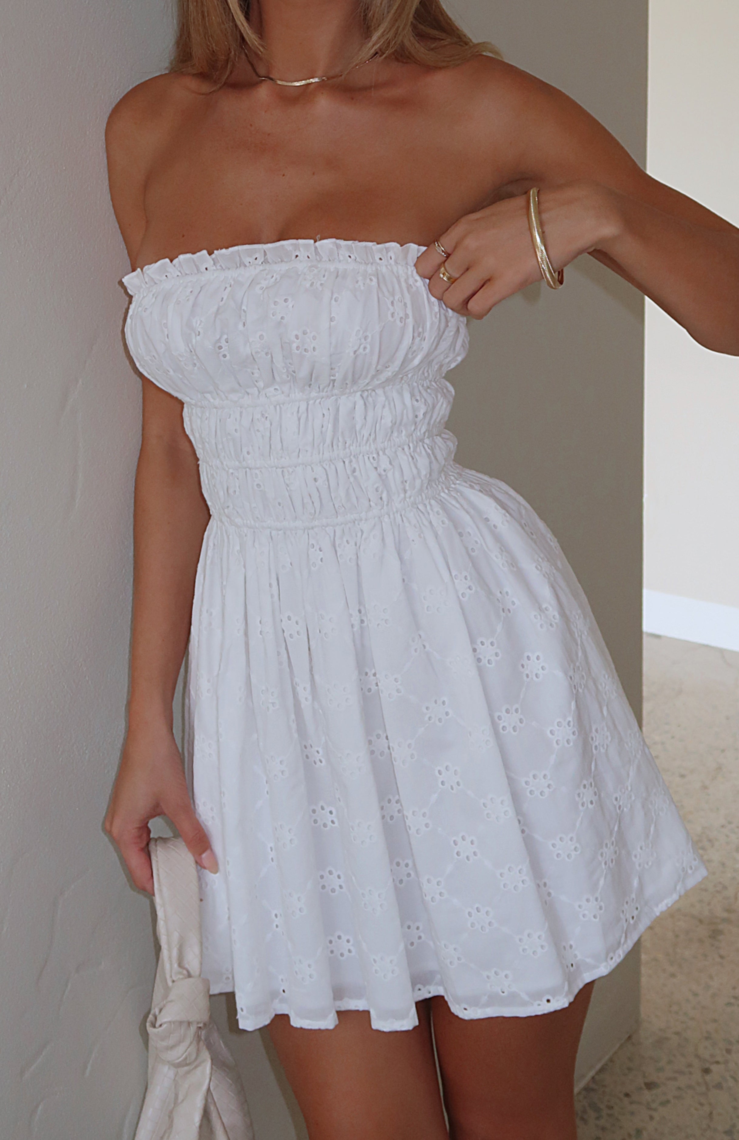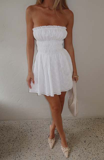 Bound to make heads turn. The Girly Girl Mini Dress White features a strapless design, ruched fabric design with elasticated tiered design for a desired fit, cotton pointelle fabric, mini length, lined to avoid sheerness and high stretch for an easy slip on design. Pair with a mini bag and kittens heel to give your fit' that extra flare.