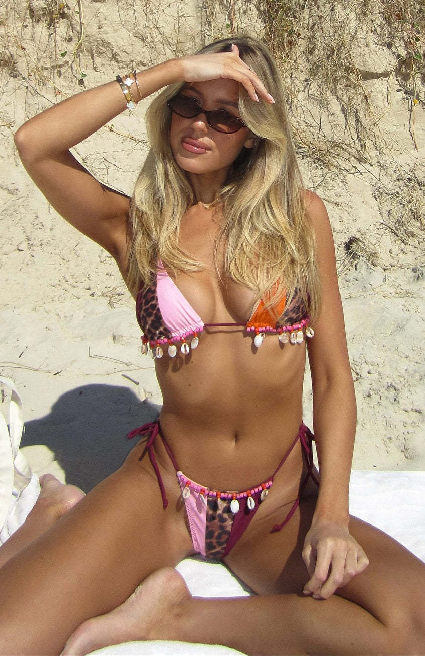 Spice up your swim wardrobe with the Katia Bikini Top in Leopard Splice! Features thin self tie halter straps with beading detailing, triangle cut with removable padding, adjustable coverage with under bust drawstring tie closing centre back and beading and shell detailing for a touch of something unique. Team with the matching Angelika Bikini Bottoms in Leopard Splice for the cheekiest set to soak in the sun.