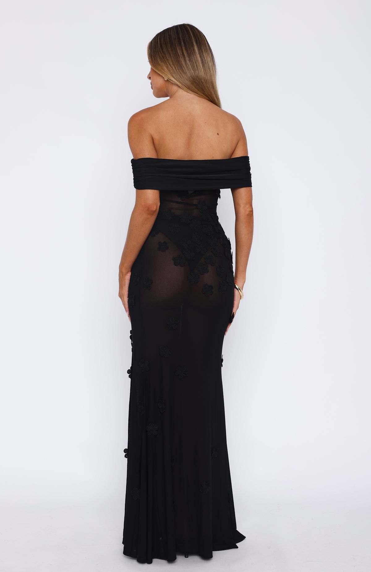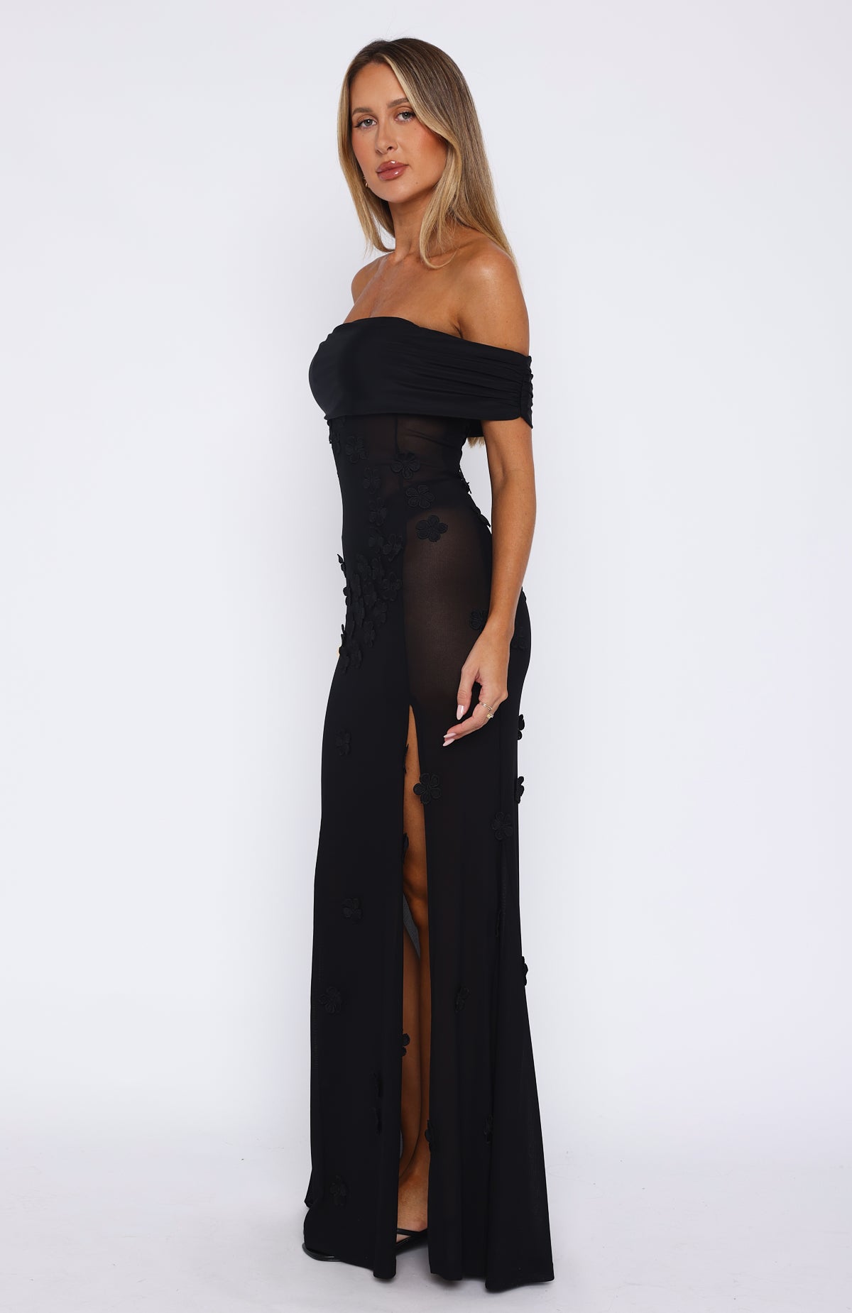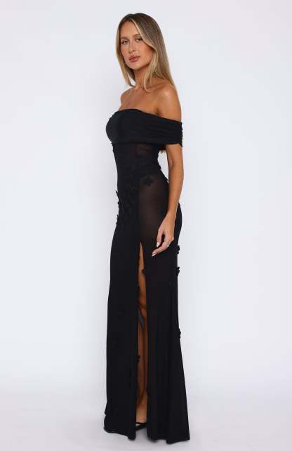 Keep it off the shoulder this summer season. The Loved The Most Maxi Dress Black features an off the shoulder design with a gathered detail, sheer mesh fabric, embroidered flower embellishment, high cut side split hemline and maxi length.