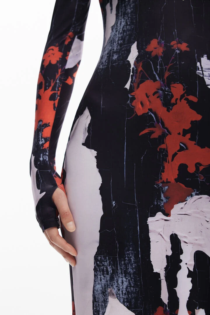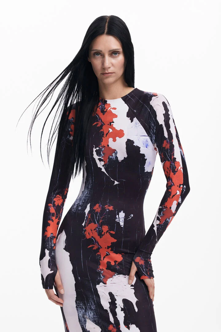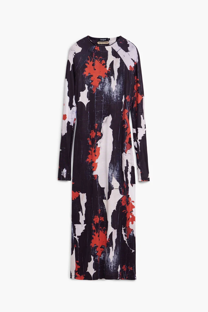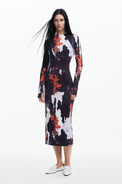 Long-sleeve slim midi dress with print designed by Alphonse Maitrepierre