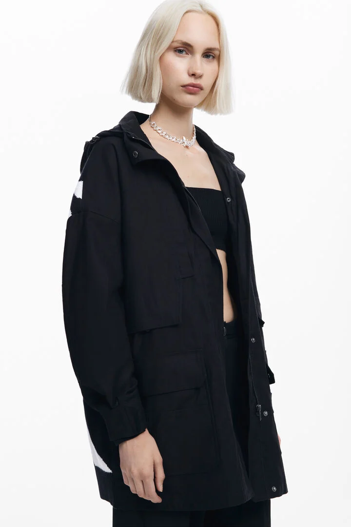 Parka with hooded collar and lining, multi-pocket, button and zipper closure, and knitted back with floral design