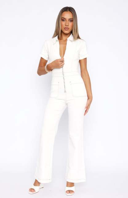 The Not About You Denim Jumpsuit White is a long length 90's styled jumpsuit. This style features a collared neckline, zip up front, short sleeves and two front patch pockets. Pair it with your favourite pair of boots for a trendy vintage look.