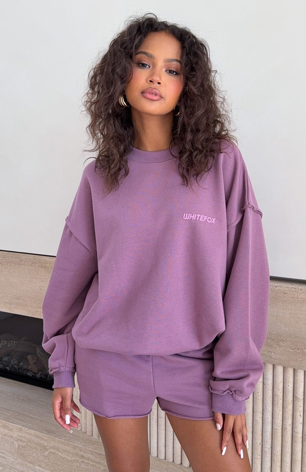Cosy and cute in the On My Own Terms Oversized Drop Shoulder Sweater Dusty Plum. Designed with ribbed crew neckline, drop shoulders and ribbed hems with raw cut detailing which round out an oversized silhouette. Featuring long sleeves, and an unlined fleece interior, this sweater delivers a cozy feel. Finished with White fox puff print text side front. Style with the matching On My Own Terms Lounge Shorts Dusty Plum or On My Own Terms Wide Leg Sweatpants Dusty Plum.