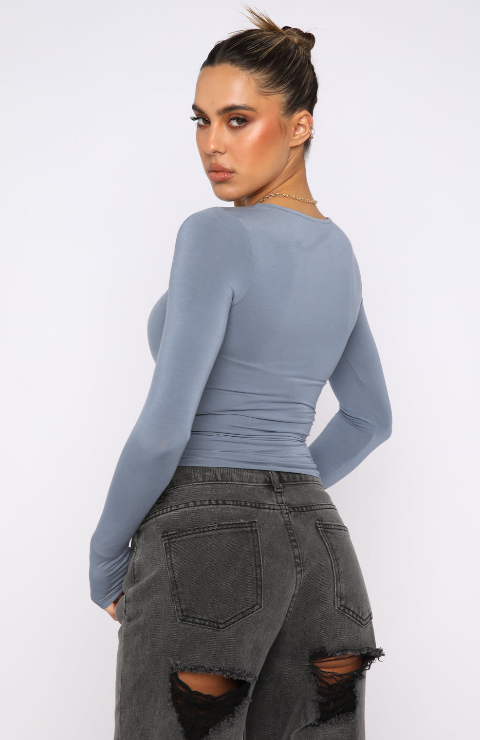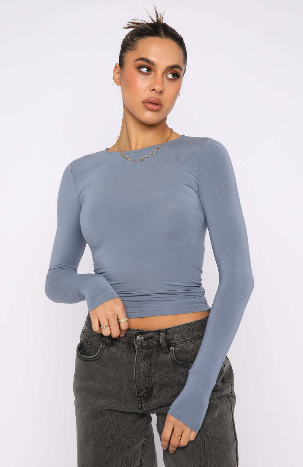 The Only For Tonight Long Sleeve Top in Steel is the basic your wardrobe is waiting for. This top is fitted with long sleeves and soft, stretch jersey fabric. Pair with your favourite pair of White Fox Denim Jeans and gold hoops for an elevated everyday look!