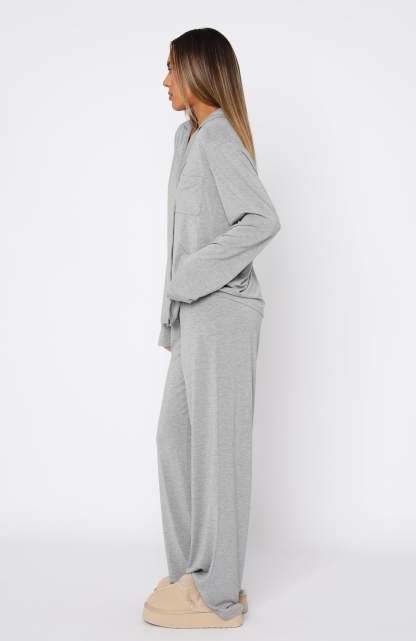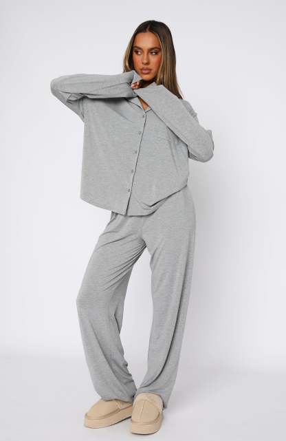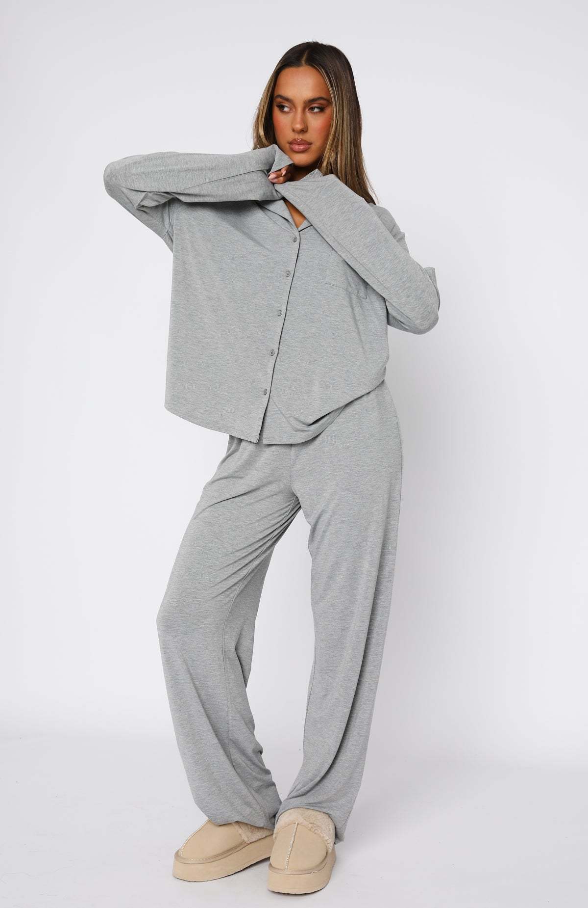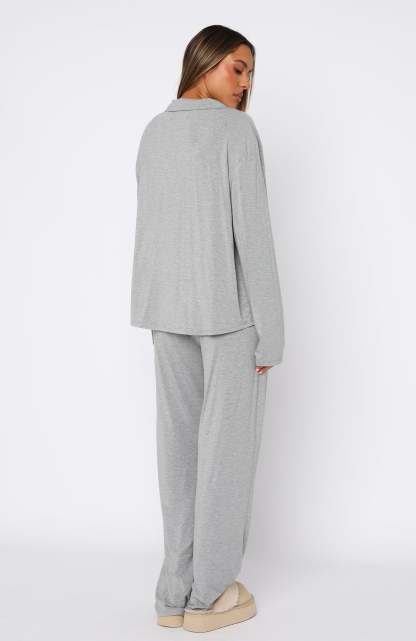 Cosy up in the pyjamas you won't be taking off this winter season! The Pillow Talk Long Sleeve Pyjama Set Grey Marle features a high stretch, soft fabric, lapel neckline, long sleeves, front button closure, elasticated waistband and lined fabric. Pair with your go-to uggs and sleep tight!