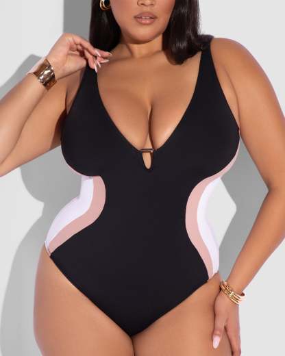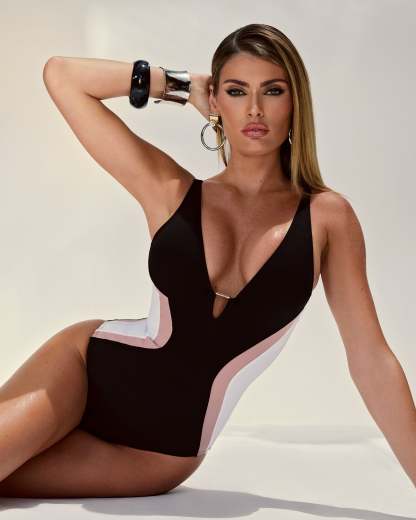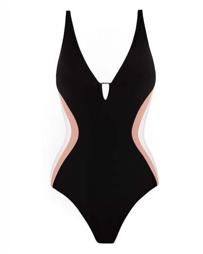 - Deep plunge neckline with encased metal hardware.