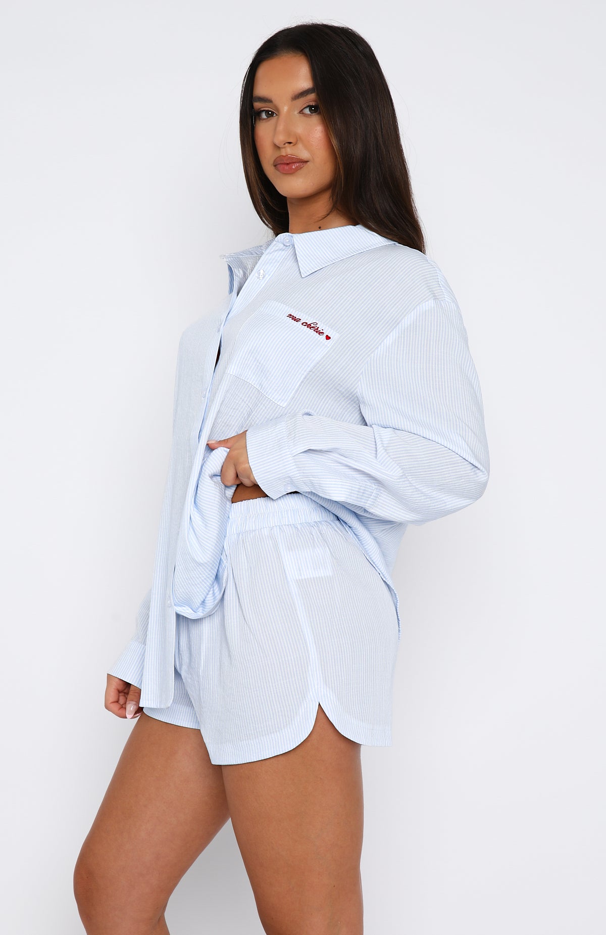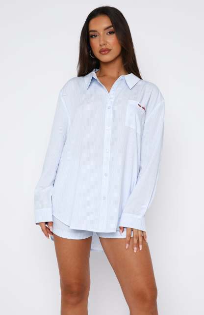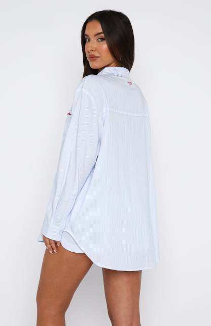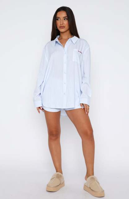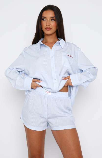 The Romi Pyjama Set Blue Stripe features a lightweight fabric, button-up front closure, collar, oversized fit, red embroidery detailing and matching shorts with elasticated waistband.