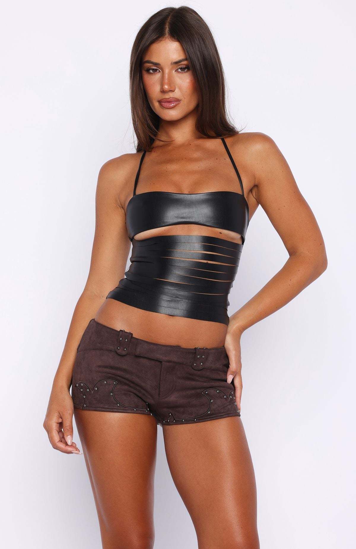 Not trying, just slayed. The Sing It Back Faux Suede Shorts in Chocolate features a fixed waistband and secure button-and-zip closure, while belt loops detailed with studs. Back pockets and stud accents along the hem amplify the attitude, and the faux suede fabrication delivers cool. Style with the Guess Again Bustier and boots for a sexy look.