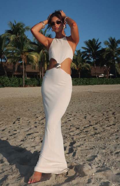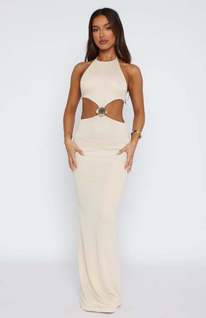 Flirty and flattering is how we could describe the Soft Sands Maxi Dress Nude. Features a halter style neckline with self-tie straps, side cut-out designs with front silver plated shell embellishment, maxi length, knitted fabric, backless design with tie-up back design and high stretch.
