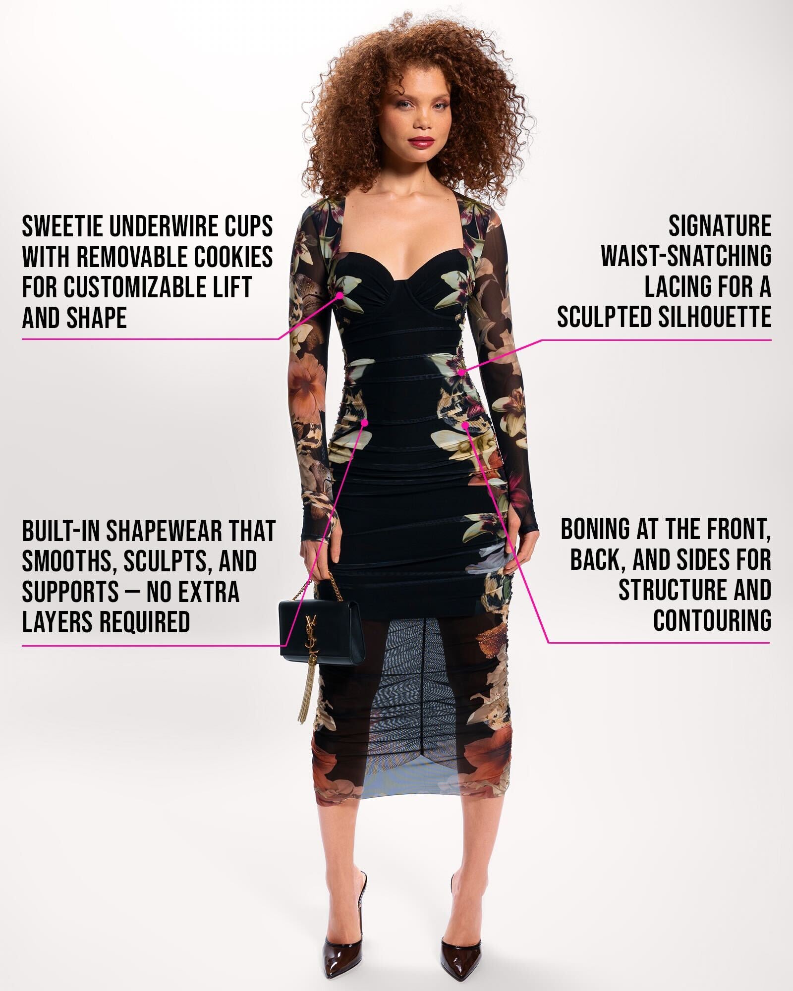 - Boning at the front, back, and sides for structure and contouring.