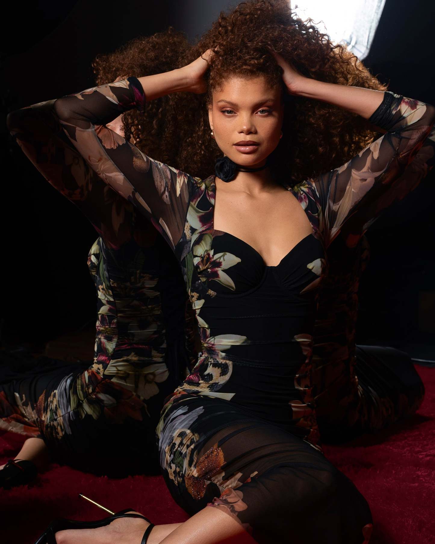 - Translucent long mesh sleeves with placed Moody Floral print.