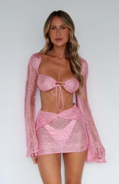 Summer skirts don't get cuter than this... Vacay Is Calling Mini Skirt Pink is a mini skirt made for sunny vacay days! Features a mid-rise fit, distressed crochet fabric, gathered waist design, sequin embellished and unlined for a sheer look. Pair with the Vacay Is Calling Long Sleeve Crop for a vacay ready fit.