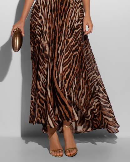 - Flowy woven chiffon maxi skirt with center-front slit.
